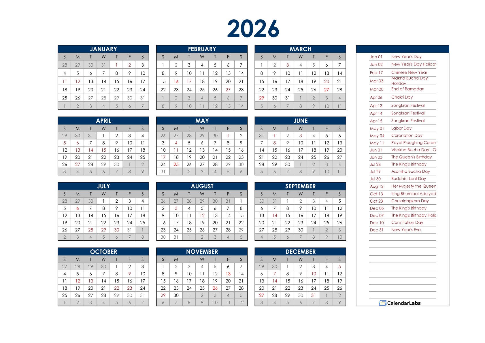 2026 THAILAND ANNUAL CALENDAR WITH HOLIDAYS