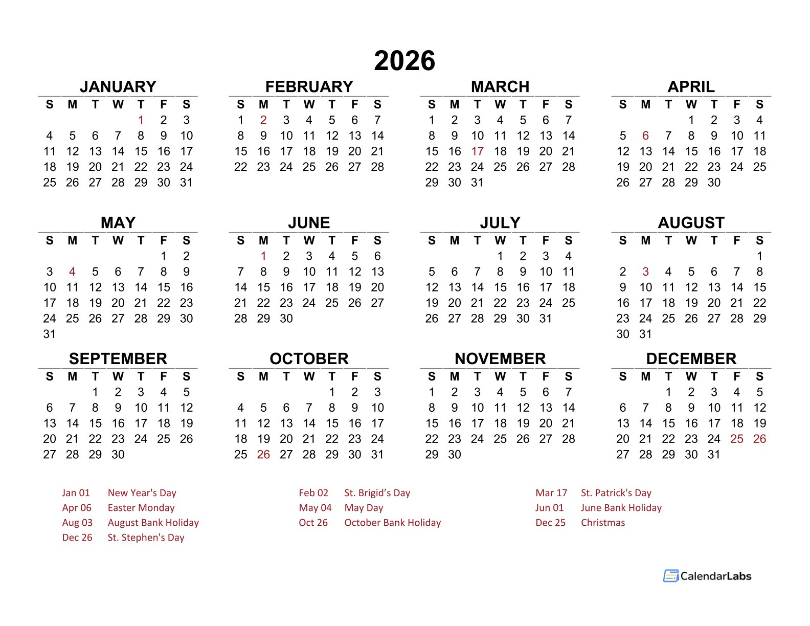 2026 YEAR AT A GLANCE CALENDAR WITH IRELAND HOLIDAYS