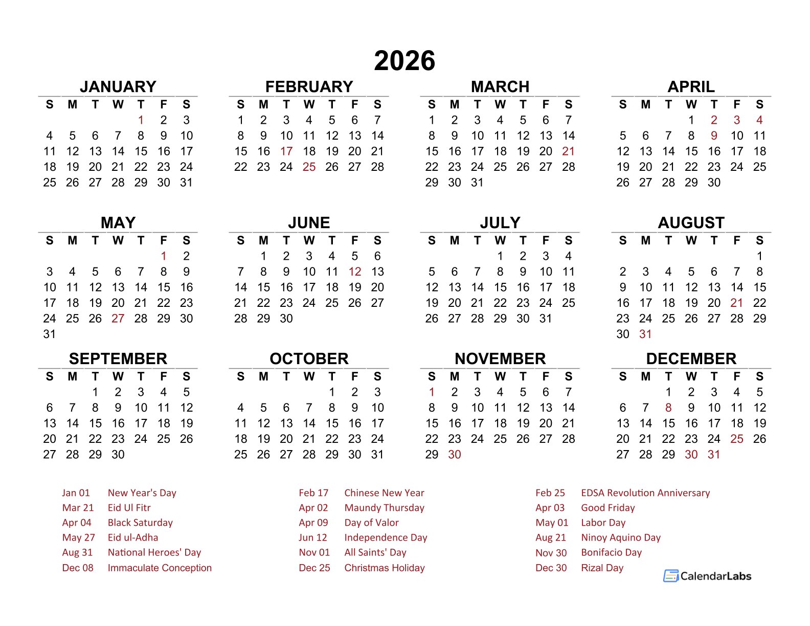 2026 YEAR AT A GLANCE CALENDAR WITH PHILIPPINES HOLIDAYS