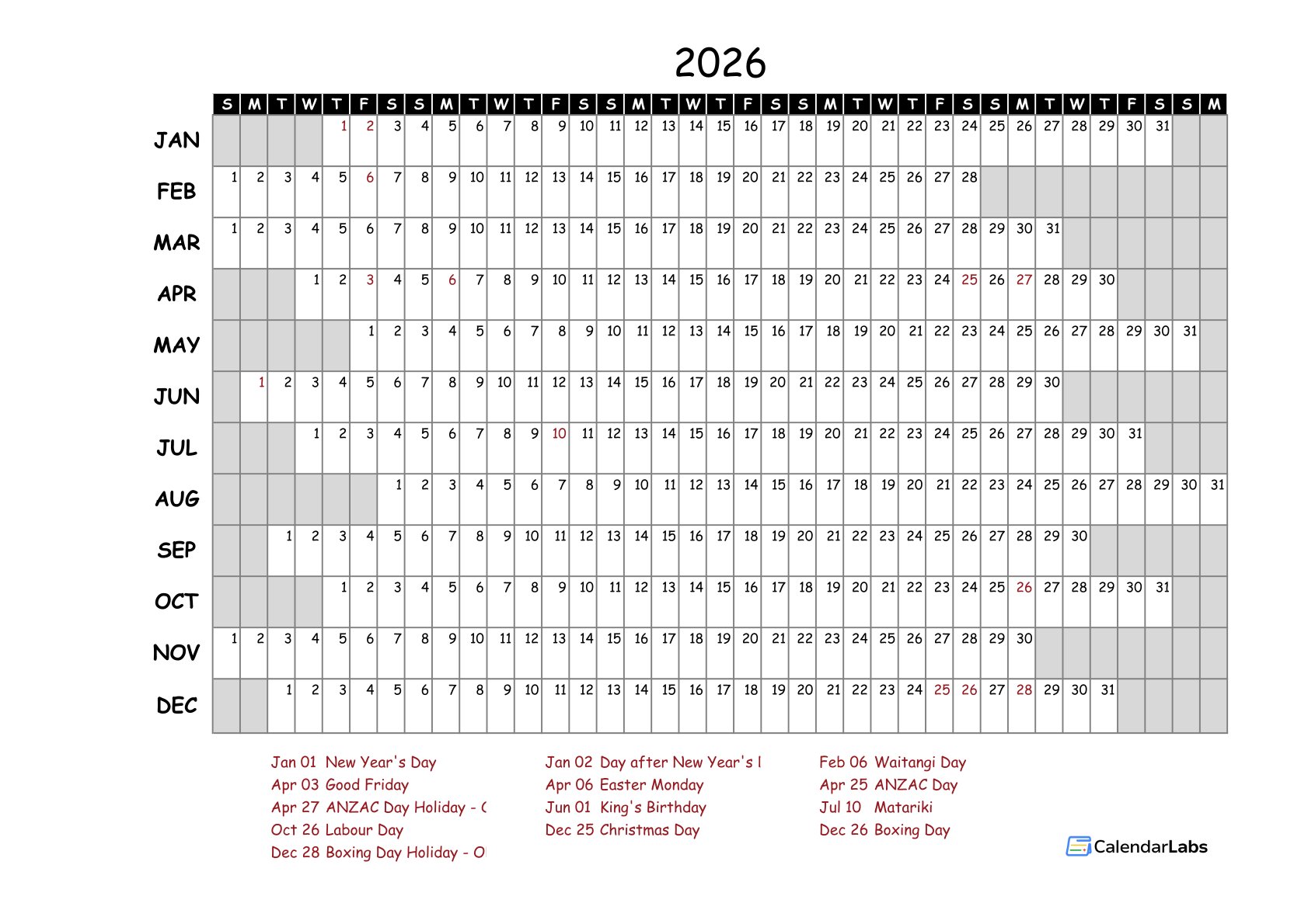2026 YEARLY PROJECT TIMELINE CALENDAR NEW ZEALAND
