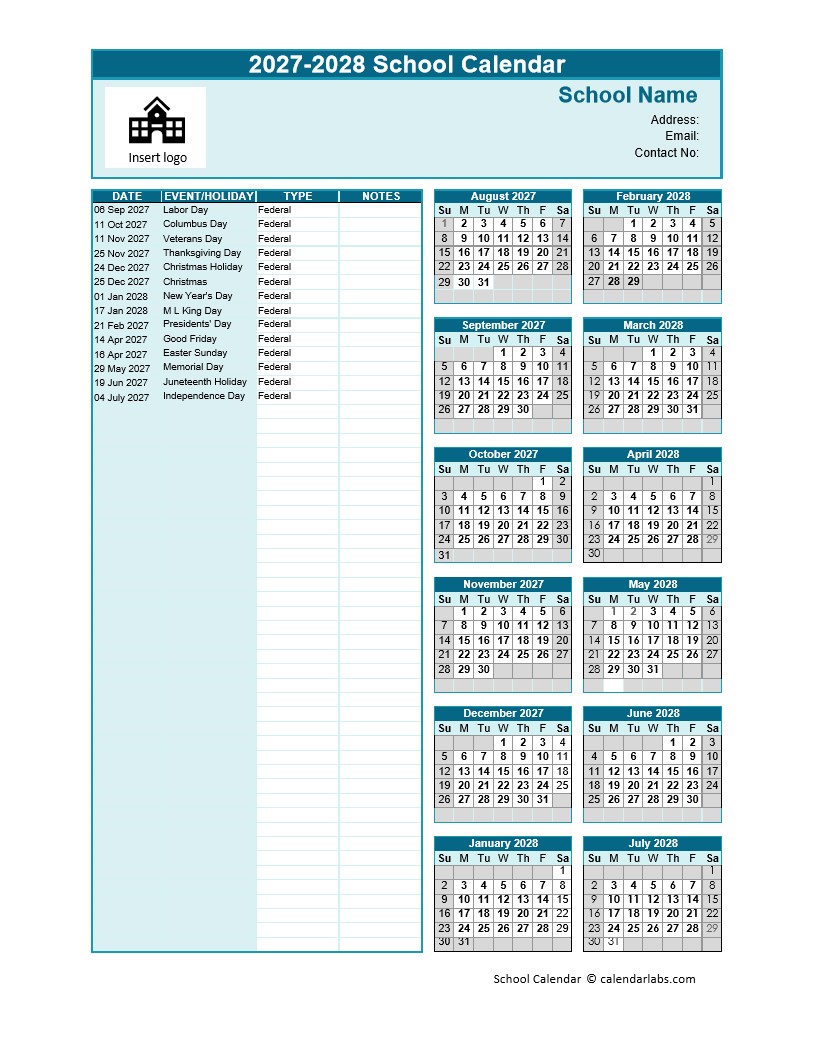 2027-2028 AUG-JUL YEARLY SCHOOL CALENDAR TEMPLATE EXCEL