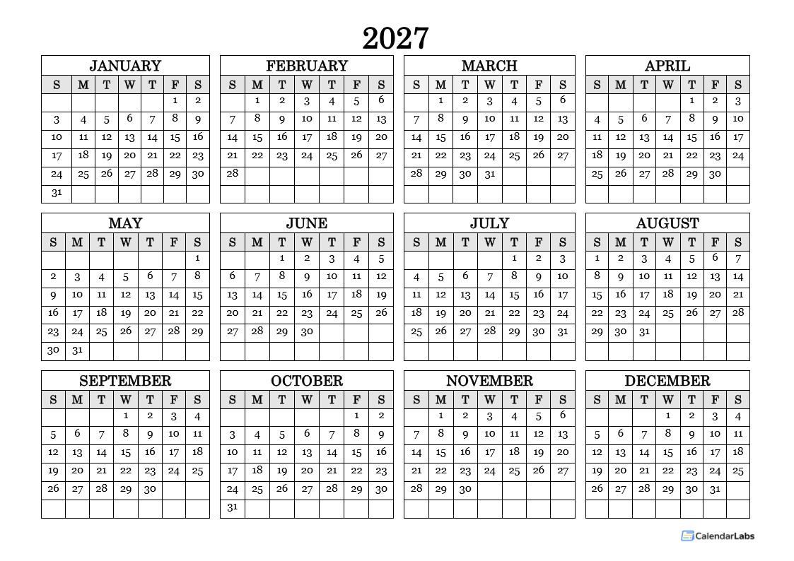2027 BLANK YEARLY CALENDAR LANDSCAPE
